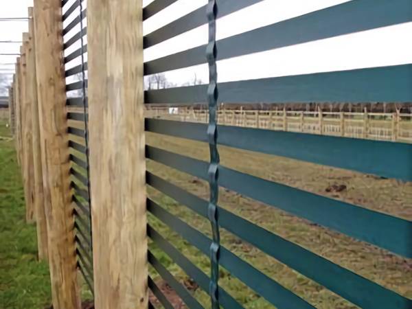 Hortifence windbreak is constructed from a series of closely spaced horizontal strips - this stripes made from polyester fibers coated with polyethylene - typically 50mm wide and 50mm apart.